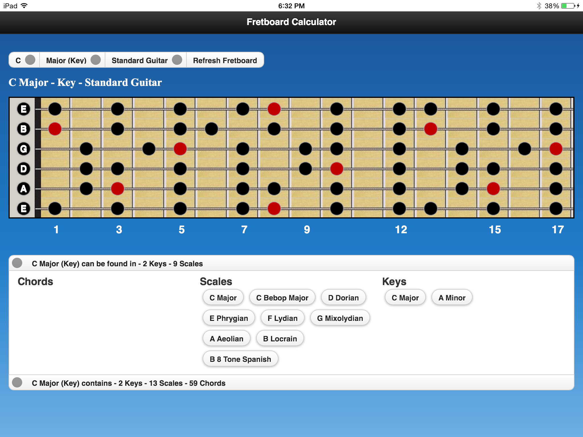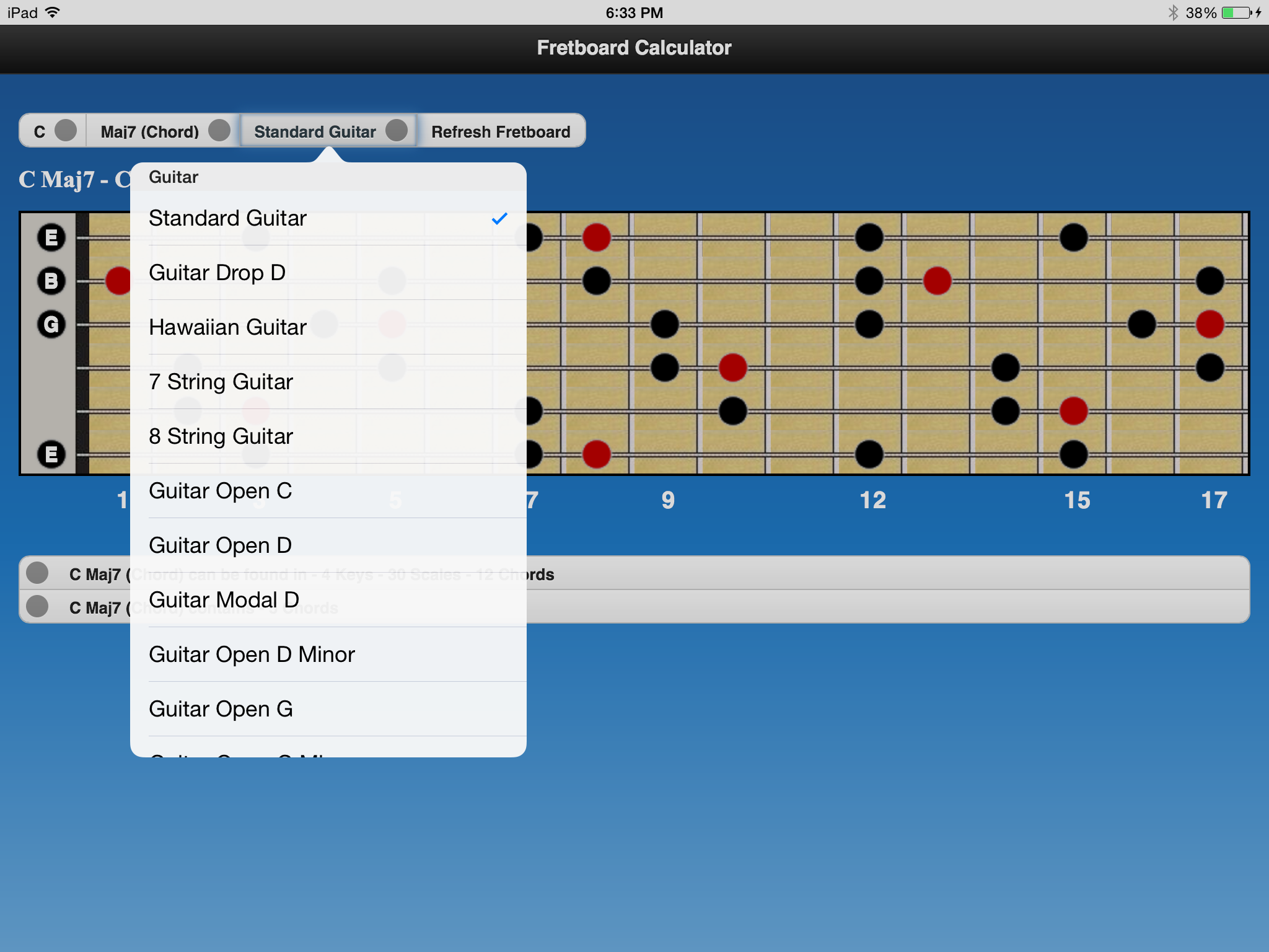 Chord illustrations in chord apps are typically limited to six-string guitar chord tones that one can capture with four fingers - six notes max. This app not only reveals chord tones over the entire fretboard but also includes a four-string bass mode, making it extremely useful to the "walking" base line student. Chord and scale selection is quick and easy (not the miserable rolling wheel). This is a wonderful app! If a note name/modal number toggle (All I see are black and red dots) and the notes on the nut were added to the mix, I'd give this app eight stars! Thanks for a great app!
