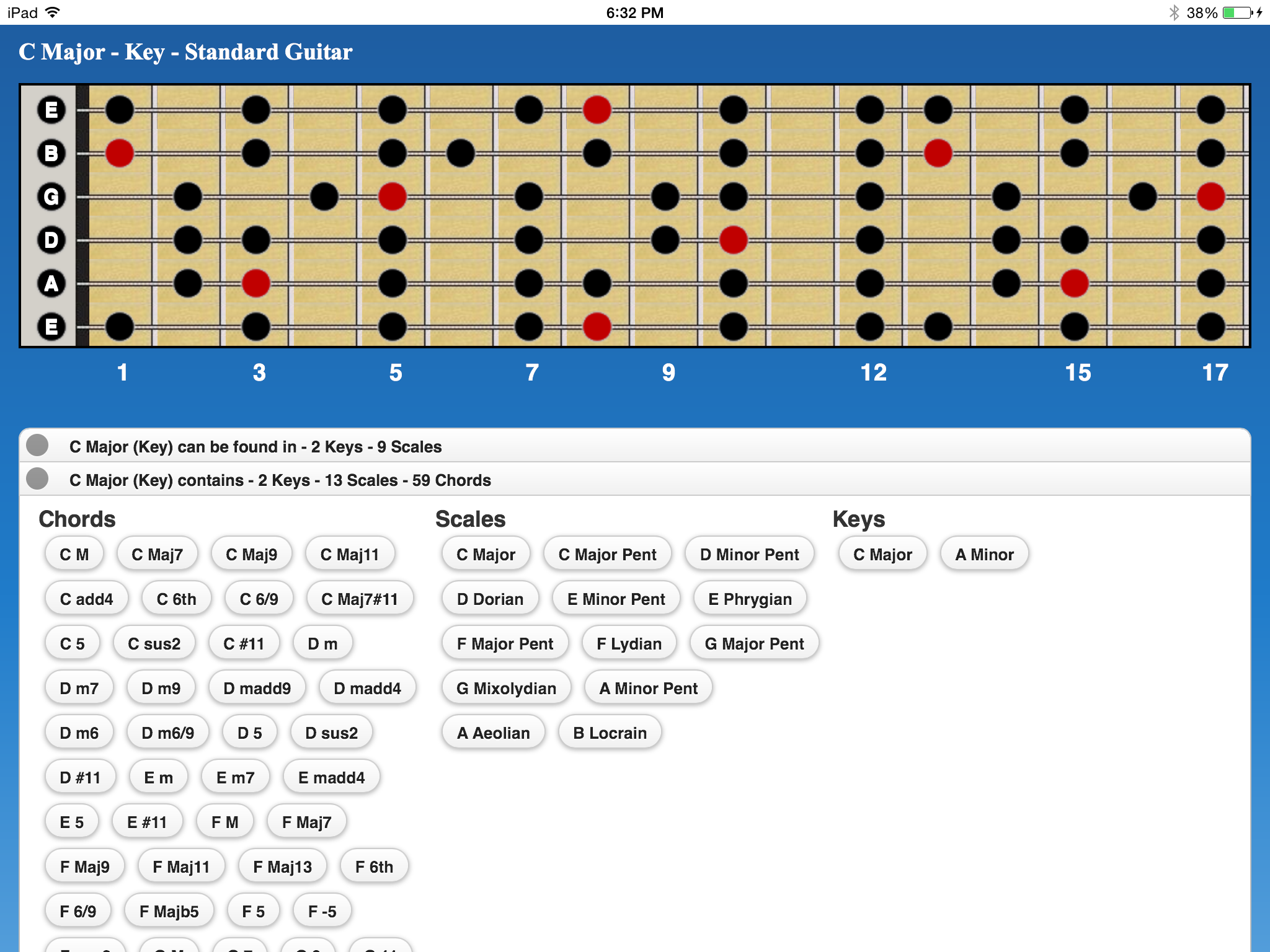 In a nice layout, it provides a complete picture of the fretboard, in my case, banjo. I have several books on scales, chords, but this APP ties it all to the fretboard. Well, worth having - useful reference and look up AP.
